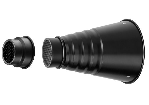 スポットライトとして被写体にハイライトを与え、より立体的に表現することができるアイテムです。 先端に取り付ける2種類のグリッドキャップ付きです。